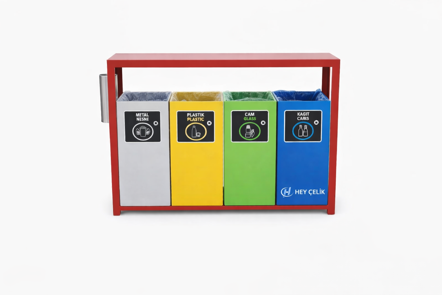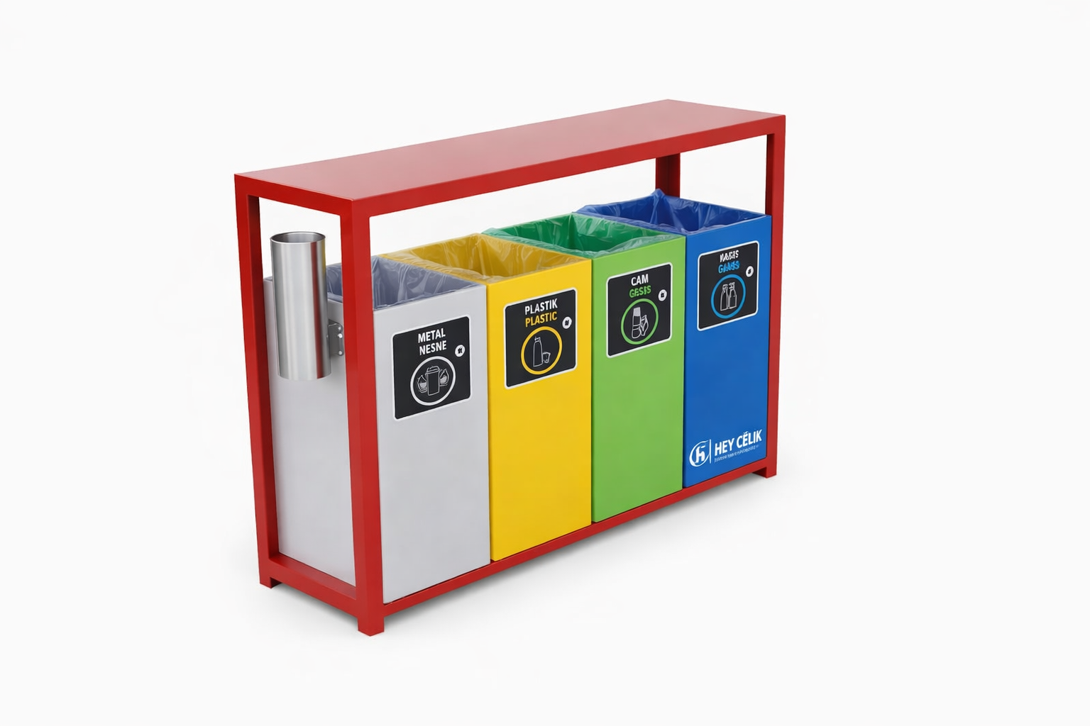 Modern tasarımı ve sağlam yapısı ile dikkat çeken bu geri dönüşüm ünitesi Hey Çelik üretim kalitesi ile hazırlanmıştır. Atıkların düzenli şekilde ayrıştırılmasını sağlayan bölmeli yapısı ile kullanım kolaylığı sunar. Belediyeler, kurumsal alanlar, oteller, AVM’ler, fabrikalar ve küçük işletmeler için uygun bir çözümdür.